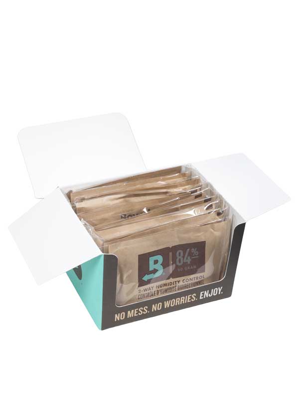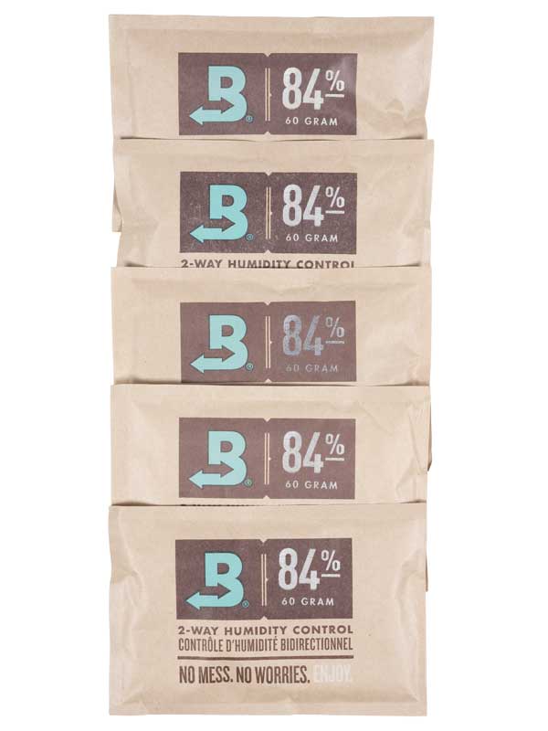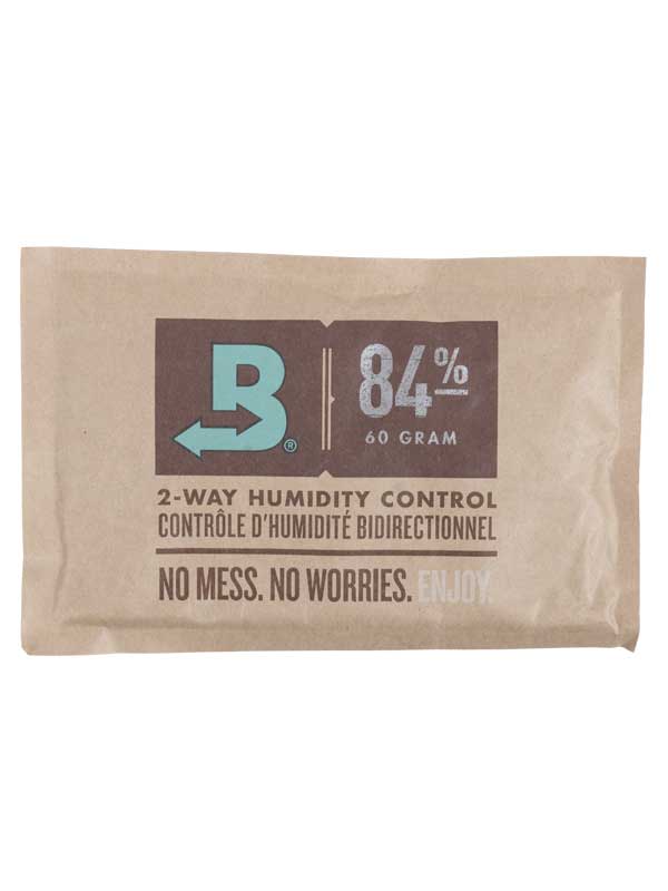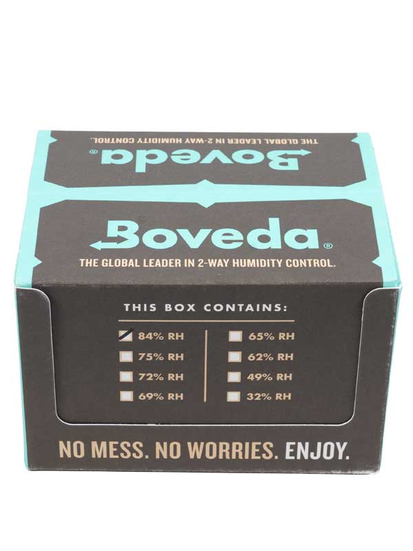 Boveda’s patented 60 gram 2-way humidity control continually responds to ambient conditions by adding or removing moisture to affect the enclosed environment and deliver the pre-determined RH (relative humidity) level printed on the pack (which in this case is 84%).