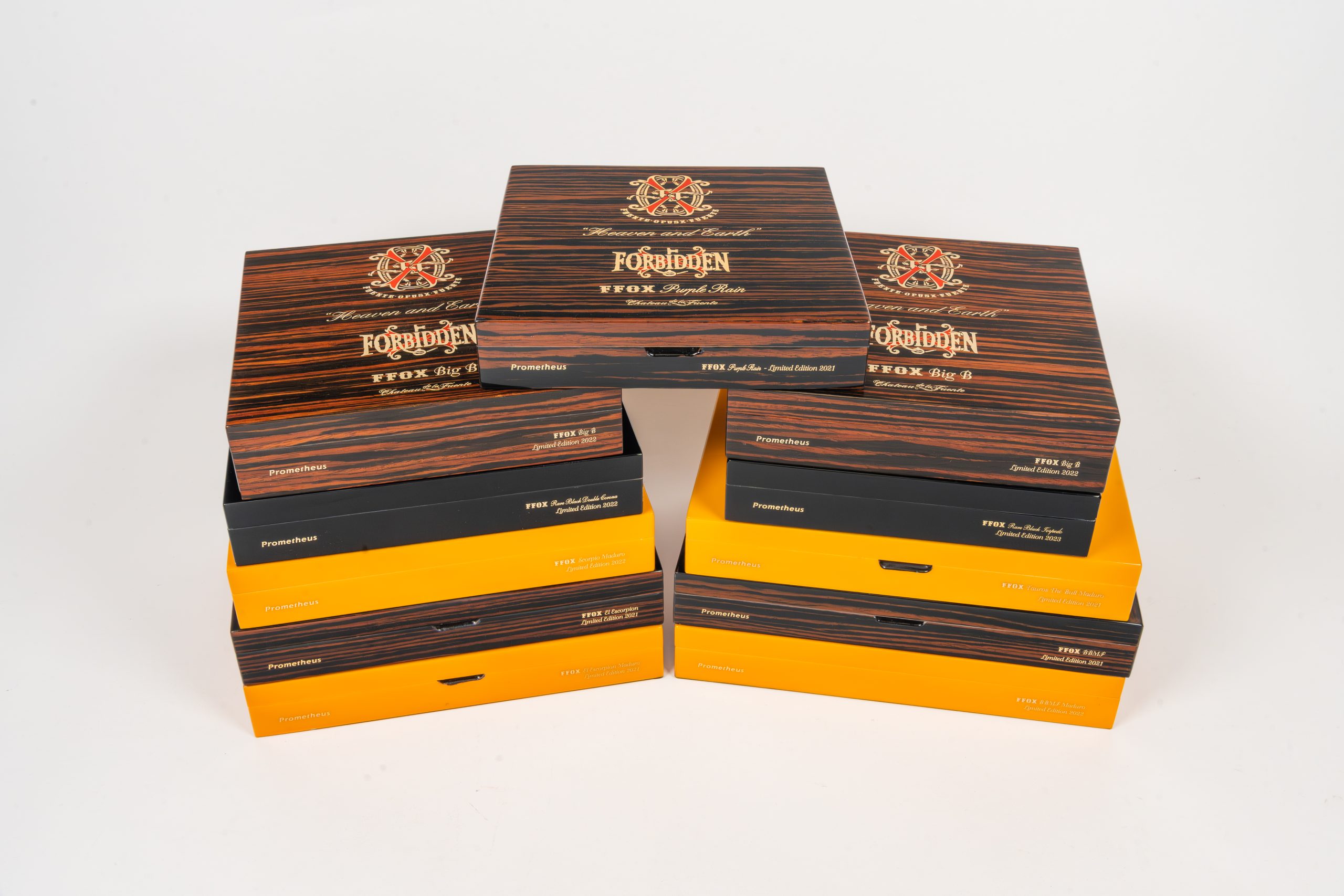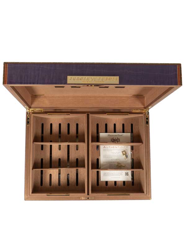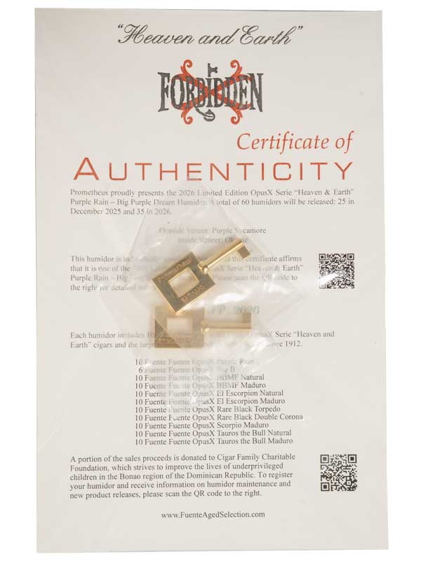The exterior is dressed in radiant Purple Sycamore that captures light with a gentle shimmer, while the interior is lined with warm Okume that cradles a treasure worthy of legend. Within each humidor rests an extraordinary collection of one hundred and six Rare Vintage OpusX Serie “Heaven and Earth” cigars. Ten of these are the famed Fuente Fuente OpusX Purple Rain, coveted for their mystique and exceptional character. They are joined by ninety six additional OpusX expressions that represent the finest achievements of the series.