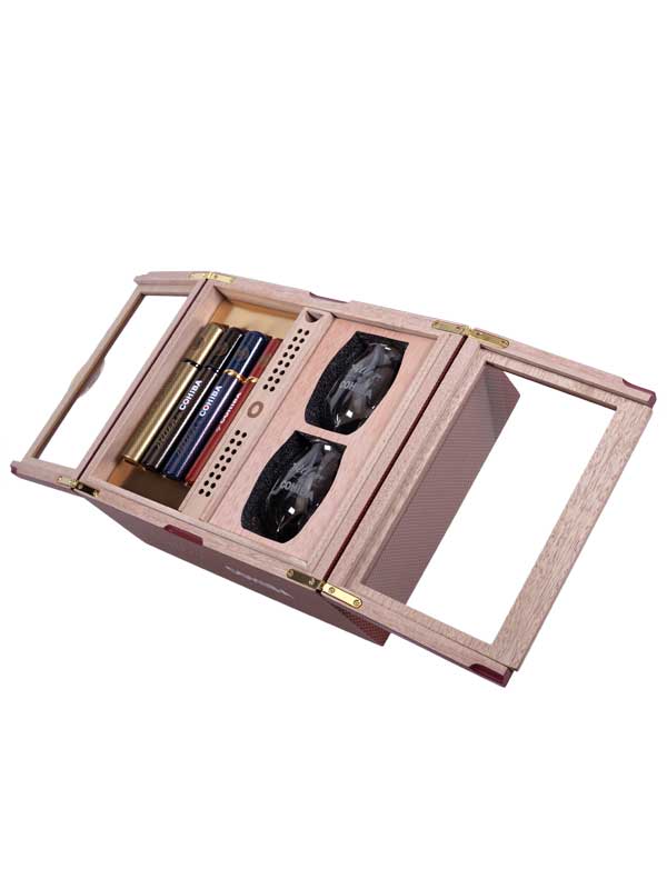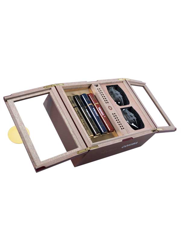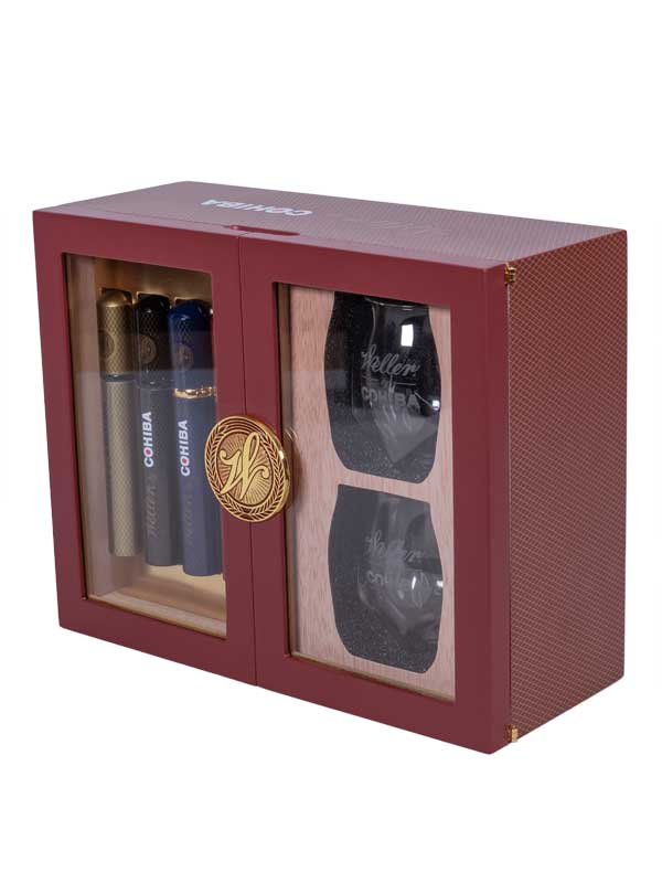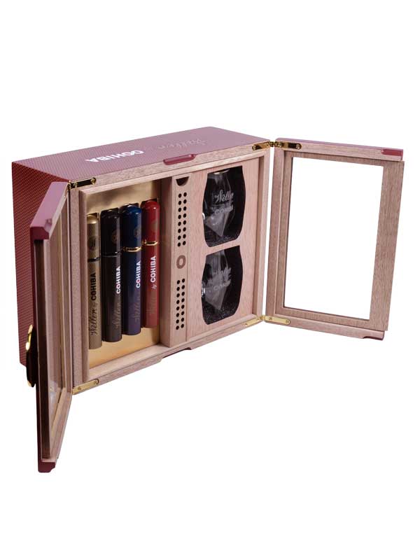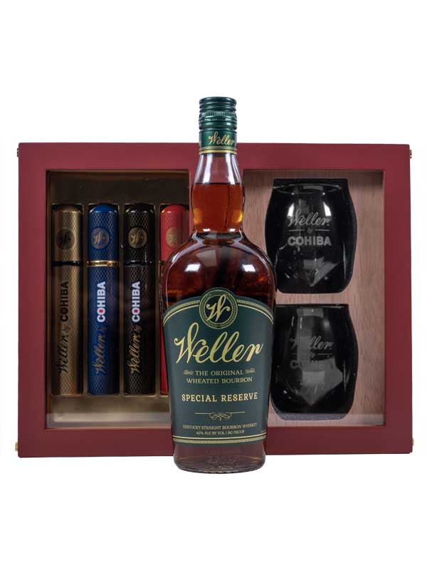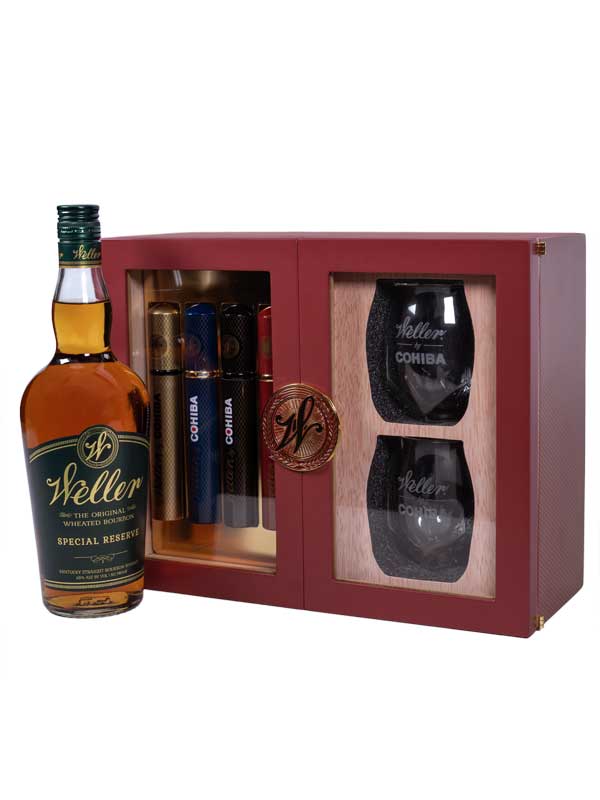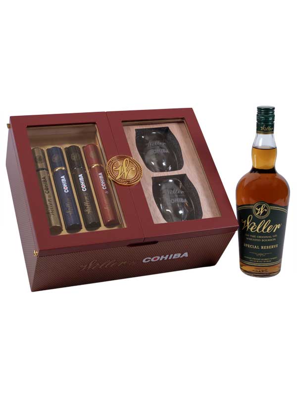 Weller by Cohiba is a collaboration between two masters of their respective crafts. Exceptional Cohiba tobacco is aged in Weller Bourbon barrels, giving the blends a unique, indulgent flavor with a smooth finish. This Holiday Gift Set contains 4 Weller by Cohiba cigars and two custom whiskey glasses beautifully presented in a Weller by Cohiba limited edition humidor.